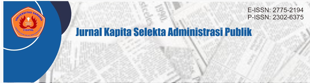 Jurnal Kapita Selekta Administrasi Publik (KSAP) adalah jurnal yang ditujukan untuk dosen, peneliti, dan mahasiswa yang ingin mempublikasikan hasil penelitiannya. Jurnal ini mencakup Ilmu Ilmu Sosial dan Ilmu Politik.